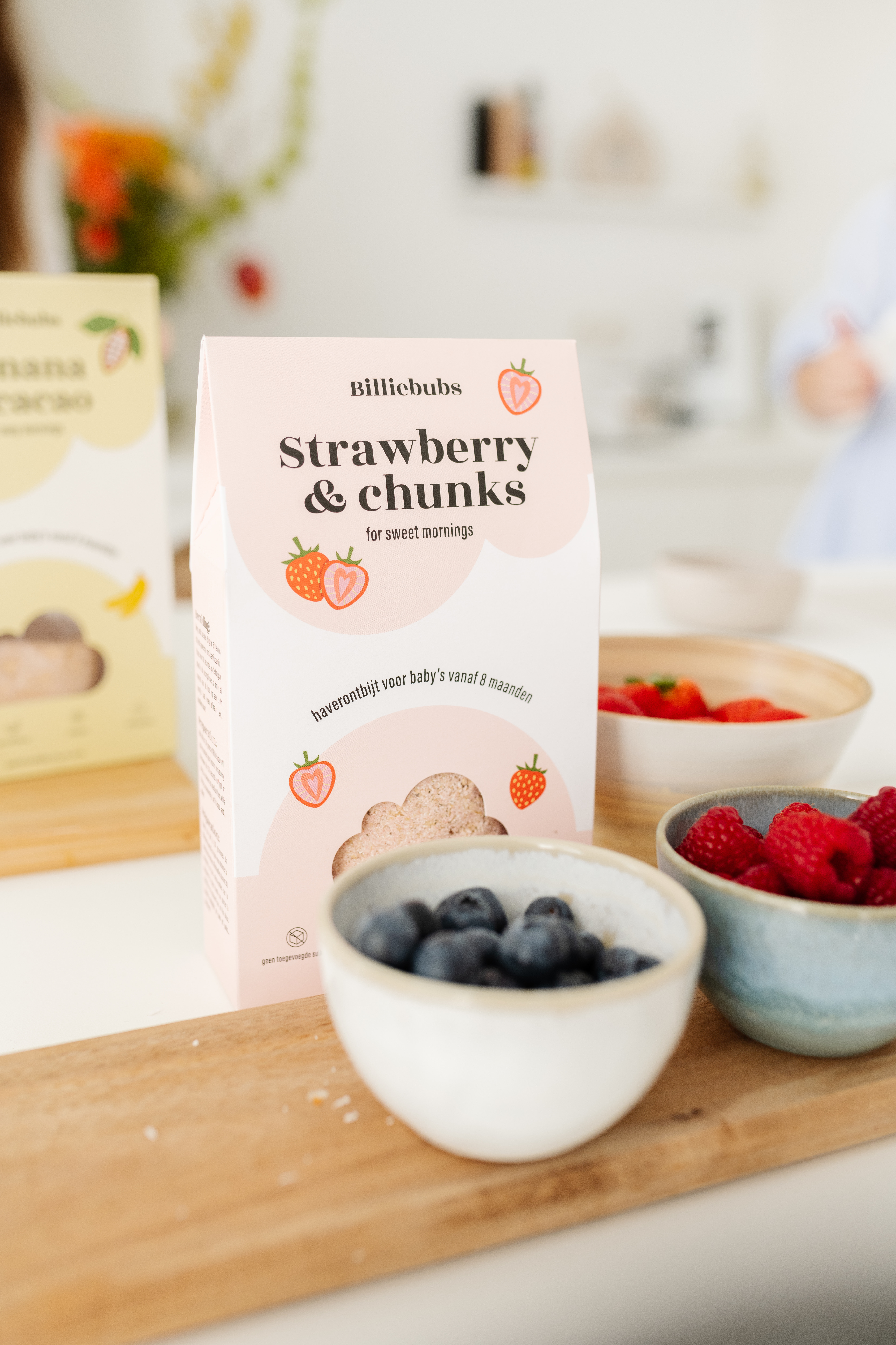 Met aardbeistukjes "for sweet mornings" (gevriesdroogd fruit).