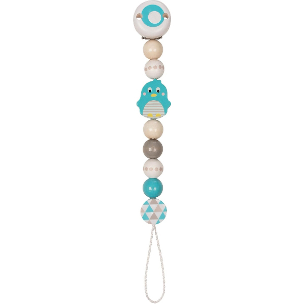 Omschrijving: Houten fopspeenketting met safety Clip om aan babykledij vast te maken, kleiner in diameter met een metalen clip voor baby’s veiligheid